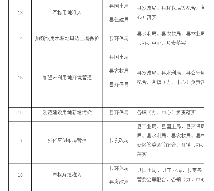 11.分用途明确管理措施。自2017年起,结合土壤污染状况详查情况,根据建设用地土壤环境调查评估结果,逐步建立污染地块名录及其开发利用的负面清单,合理确定土地用途。符合相应规划用地土壤环境质量要求的地块,可进入用地程序。暂不开发利用或现阶段不具备治理修复条件的污染地块,由县政府组织划定管控区域,设立标识,发布公告,开展土壤、地表水、地下水、空气环境监测;发现污染扩散的,有关责任主体要及时采取污染物隔离、阻断等环境风险管控措施。(国土局牵头,环保局、住建局、水利局参与)