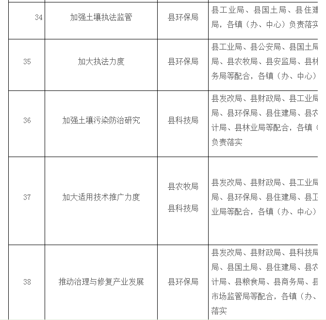 37.加大适用技术推广力度。建立健全技术体系,综合我县土壤污染类型、程度和区域代表性,针对典型受污染农用地、污染地块,分批实施土壤污染治理与修复技术应用试点项目。(农牧局牵头,科技局、发改局、财政局、环保局、国土局、住建局、工业局、卫计局、林业局参与)