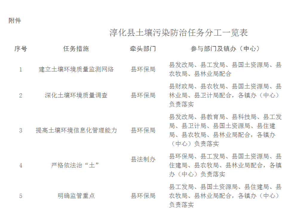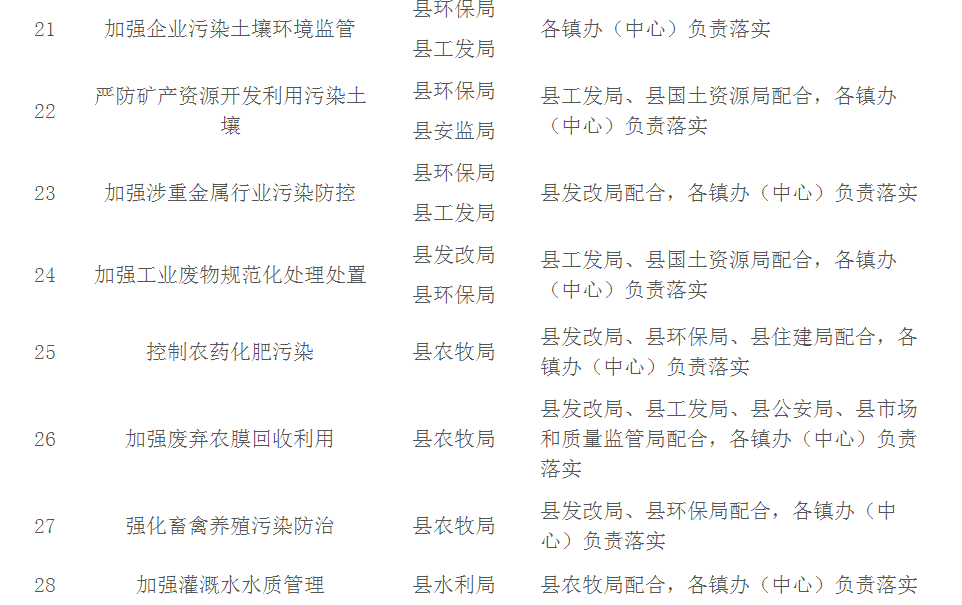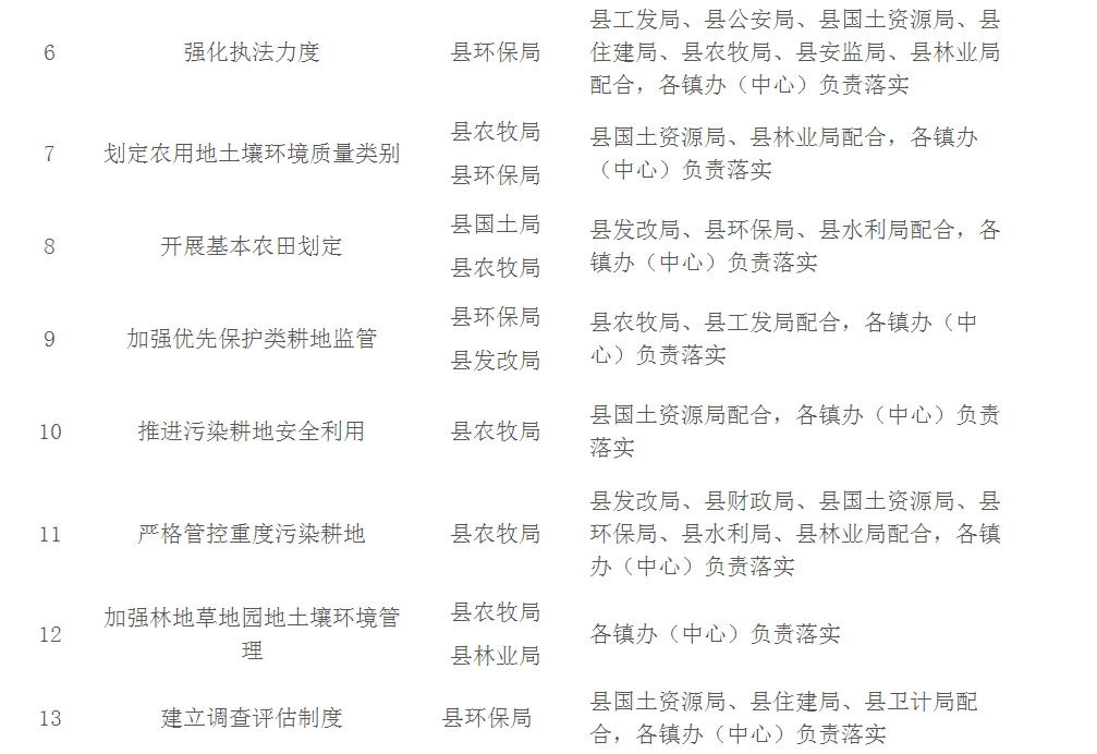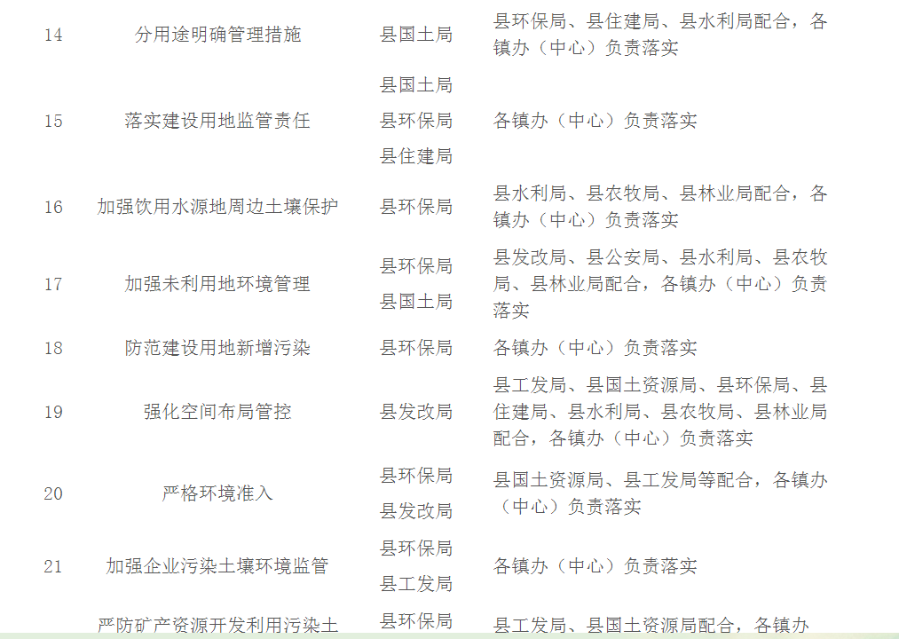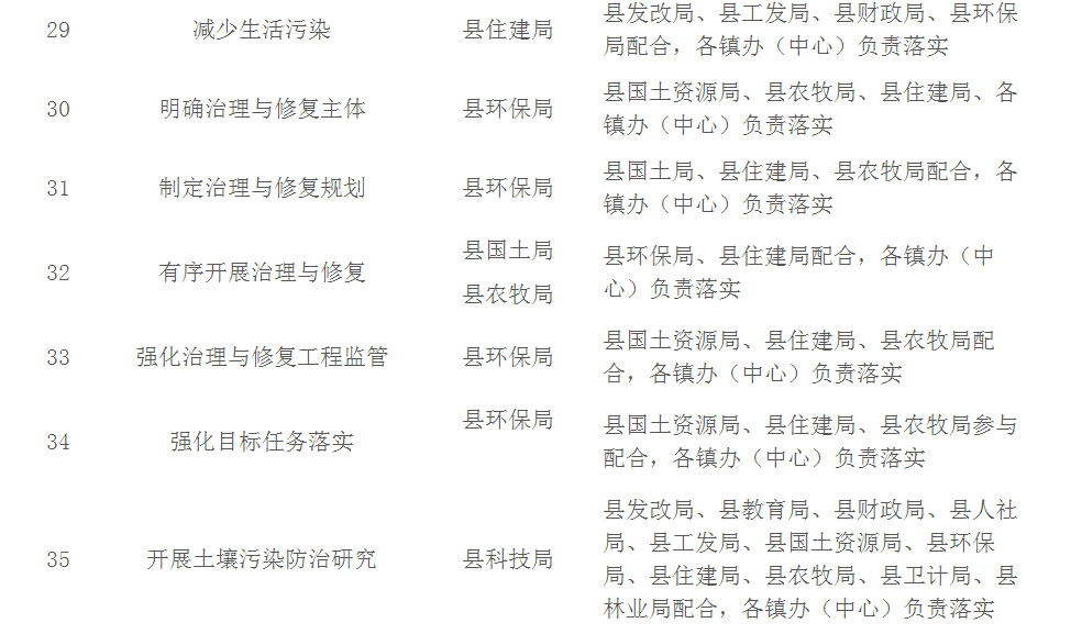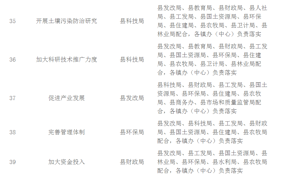 (三十八)完善管理体制。落实土壤污染防治属地责任。按照环境质量辖区负责制,建立完善土壤环境管理和土壤污染防治联动协作机制,明确部门职责分工,加强土壤环境保护。(县环保局牵头,县发改局、县科技局、县工发局、县财政局、县国土资源局、县住建局、县林业局、县农牧局参与)