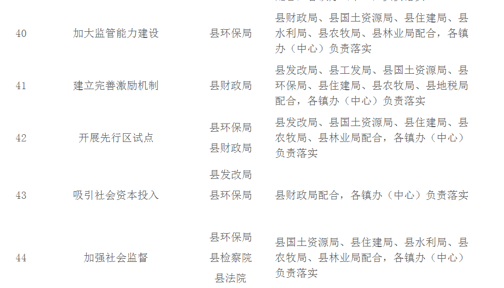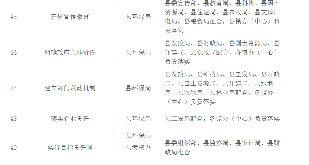 (四十六)落实政府主体责任。各镇办(中心)和有关部门是落实全县土壤污染防治工作方案的主体。要加强组织领导,完善政策措施,加大资金投入,强化监督管理,抓好工作落实。制订并公布全县土壤污染防治工作方案,确定重点任务和工作目标,明确责任主体;每年要制定年度实施计划,明确重点任务实施进度。(县环保局牵头,县发改局、县财政局、县国土资源局、县住建局、县农牧局、县林业局参与)