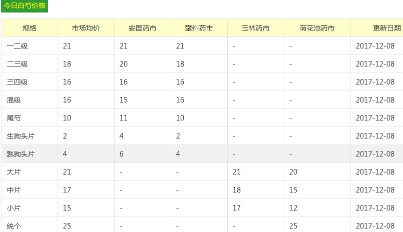 而到了2017年,白芍行情较为低迷,安徽统货价格从年初的17元下调至目前的15元,当前白芍正是产新期,根据白芍的生长周期测算,今年产新的白芍都是13-14年高价位期间种植的,故产量会较往年有所增长,加上市场陈货,今年市场白芍存量总体较丰。当前饮片厂等需求单位正积极采购加工,但如此散的品种后市要说价格上涨其实概率不大,所以在2018年预测后市行情以低位稳定为主。