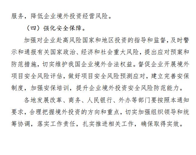 其中,支持境内有能力、有条件的企业积极稳妥开展境外投资活动,推进“一带一路”建设,深化国际产能合作,带动国内优势产能、优质装备、适用技术输出,提升我国技术研发和生产制造能力,弥补我国能源资源短缺,推动我国相关产业提质升级。