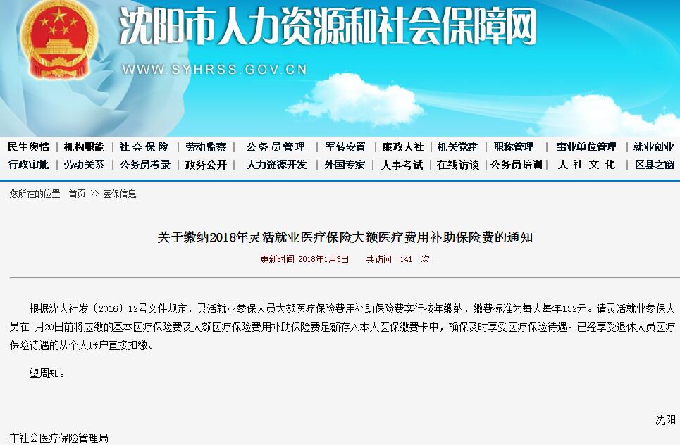 根据沈人社发〔2016〕12号文件规定,灵活就业参保人员大额医疗保险费用补助保险费实行按年缴纳,缴费标准为每人每年132元。请灵活就业参保人员在1月20日前将应缴的基本医疗保险费及大额医疗保险费用补助保险费足额存入本人医保缴费卡中,确保及时享受医疗保险待遇。已经享受退休人员医疗保险待遇的从个人账户直接扣缴。
