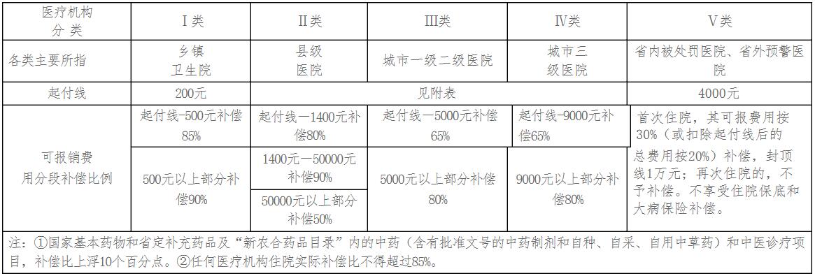 1.省内普通住院补偿起付线和补偿比例。按医疗机构类别,分别设立不同的起付线和补偿比例,多次住院,分次计算起付线,起付线以下费用个人自付。五保户住院不设起付线;低保户、重点优抚对象、农村持证重度残疾人住院只免除参合年度内首次住院起付线;住院可报销费用未达起付线的不予补偿。恶性肿瘤放化疗等需要分疗程间段多次住院的特殊慢性病患者、白血病患者、脑瘫康复治疗患者等在同一医院多次住院治疗的,只设一次起付线(预警医院除外)。