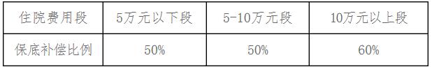 3.住院保底补偿。为保障Ⅲ—Ⅳ类医疗机构住院病人实际补偿比,重点提高大额费用住院病人实际补偿比例,对不同额度的住院医药费用实行分段保底补偿。即其实际补偿所得金额与住院总费用扣除保底起付线(住院起付线+不计入补偿的材料费、药品费、检查费)后的余额相比,达不到保底补偿比例的,则按分段保底补偿。保底补偿比例如下: