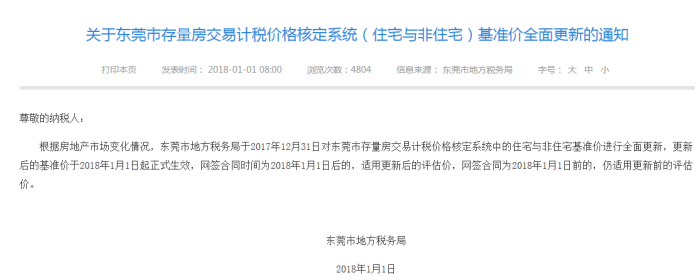 《通知》显示,根据房地产市场变化情况,东莞市地方税务局于2017年12月31日对东莞市存量房交易计税价格核定系统中的住宅与非住宅基准价进行全面更新,更新后的基准价于2018年1月1日起正式生效,网签合同时间为2018年1月1日后的,适用更新后的评估价,网签合同为2018年1月1日前的,仍适用更新前的评估价。