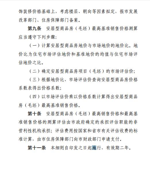 细则适用于安居型商品房(毛坯)最高销售价格、最高基准销售价格和户内装饰装修价格的确定。根据《细则》,安居型商品房(毛坯)最高销售价格是在评估确定的毛坯房最高基准销售价格基础上,考虑楼层、朝向等因素调整得出的最高价格;超过其市场评估价70%的,以市场评估价的70%为最高销售价格。市场评估价是指假设该项目作为普通商品住房项目时,按照估价技术规范评估所得出的市场价格。