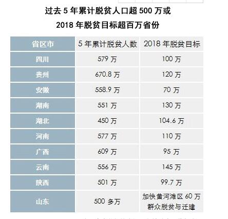 据统计,6省2018年脱贫目标均超过百万,分别是四川、贵州、湖南、湖北、河南和云南。陕西今年脱贫目标为99.7万,与百万近在咫尺。