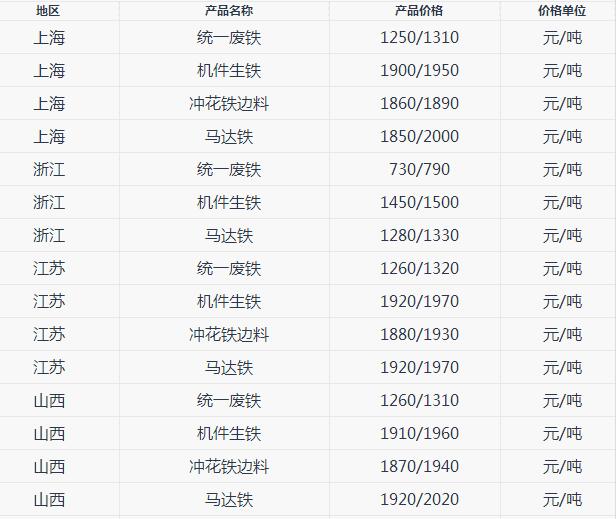 根据下表生铁价格不同地区有所差异,基本在3000-3500元/吨左右。