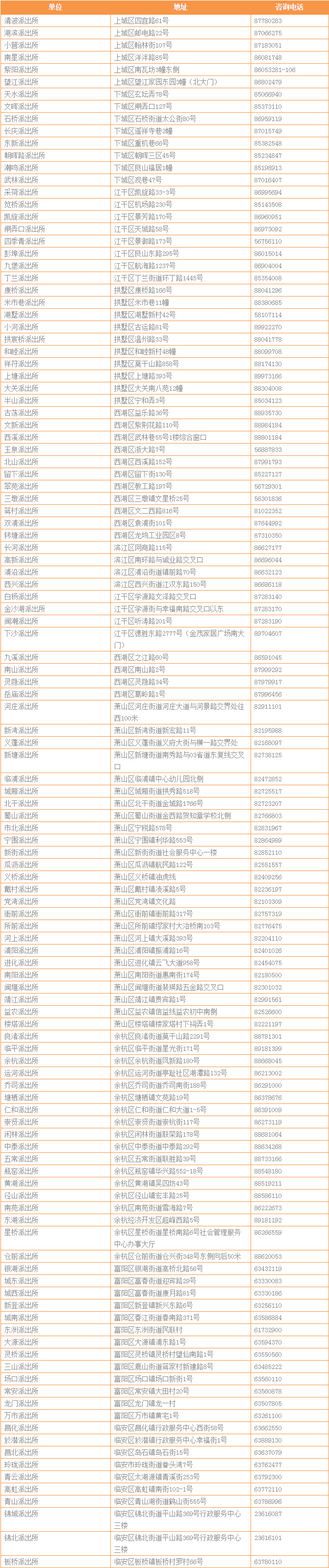 杭州市各派出所均可办理落户,具体联系方式如下。