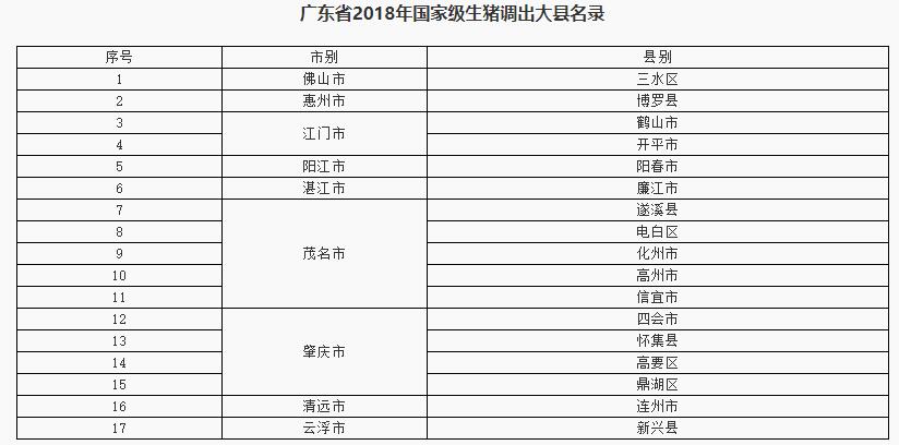 广东省2018年国家级生猪调出大县名录