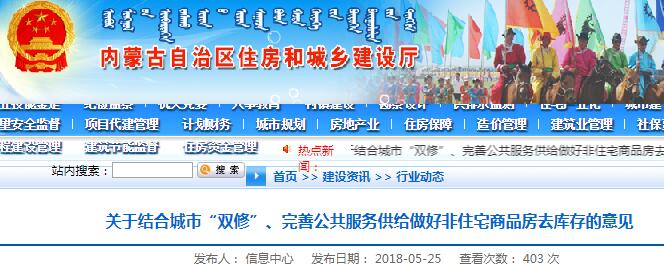 5月25日,内蒙古自治区住建厅、财政厅、发改委等7部门于近期联合下发《关于结合城市“双修”、完善公共服务供给做好非住宅商品房去库存的意见》,鼓励以置换、购买等方式消化非住宅商品房。