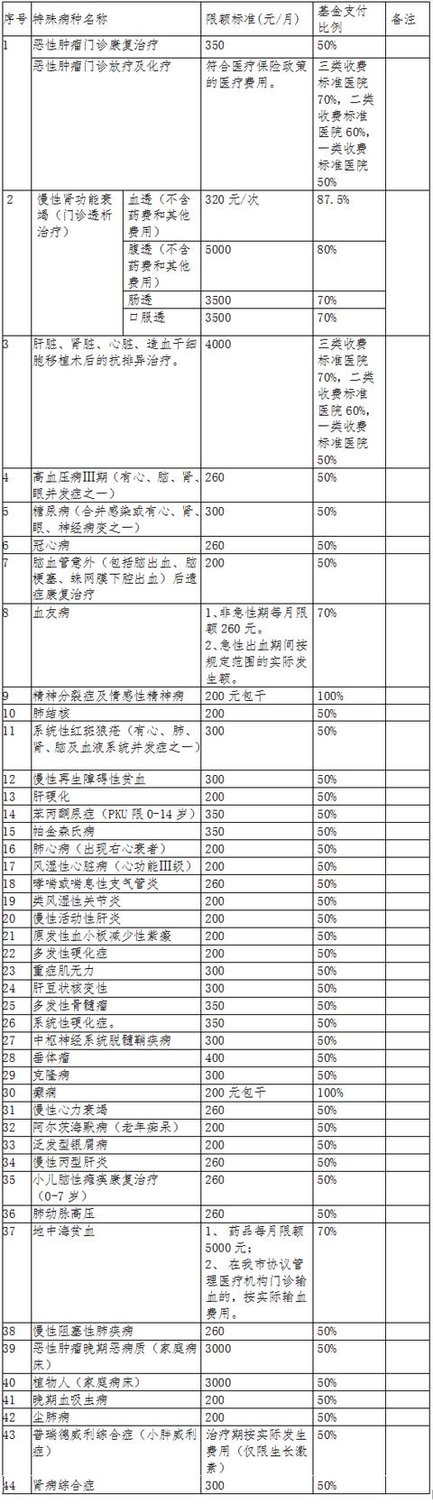 恶性肿瘤门诊康复治疗、恶性肿瘤门诊放疗及化疗,慢性肾功能衰竭(门诊透析治疗),肝脏、肾脏、心脏、造血干细胞移植术后的抗排异治疗,慢性活动性肝炎,肺结核,多发性骨髓瘤,慢性丙型肝炎,恶性肿瘤晚期恶病质(家庭病床),植物人(家庭病床)。