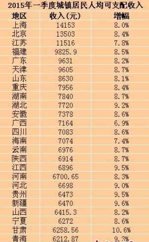 近期,中国各地2015年一季度居民收入数据陆续出炉。据不完全统计,截至4月27日,全国25个省(区、市)已公布了一季度城镇居民人均可支配收入。其中,上海以14153元排名榜首,甘肃增幅全国最高。