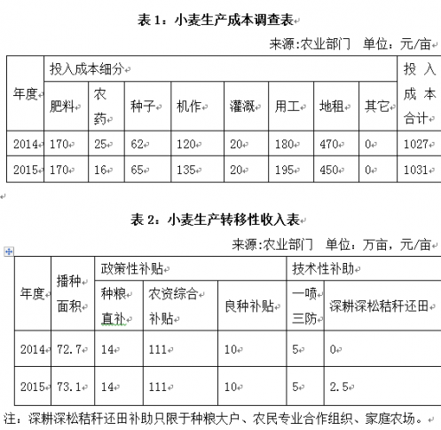 小麦生产转移性收入为每亩142.5元,其中政策性补贴为每亩135元(其中种粮直补为每亩14元,农资综合补贴为每亩111元,良种补贴为每亩10元),技术性补助为每亩7.5元(见表2)。调查期间还未发放。