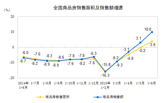 今天,国家统计局公布2015年上半年全国房地产开发和销售情况。数据显示,1-6月份,全国房地产开发投资43955亿元,同比名义增长4.6%,其中,住宅投资29506亿元,增长2.8%。同时,商品房销售面积50264万平方米,同比增长3.9%。