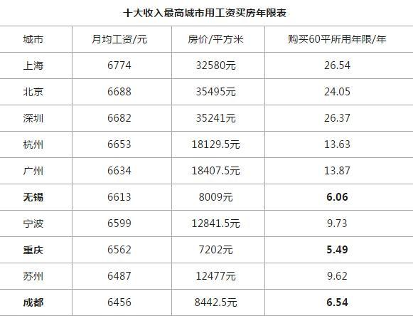 在平均工资最高的前十个城市中,重庆、无锡、成都的工资与房价差距是最小的,重庆只要5年多的工资就可以买套60平米的小房子给自己安个家;无锡和成都也只用6年多的工资就可以完成买房大计。对于将买房作为人生最大目标的国人来说,这三个城市无疑是最佳的选择。