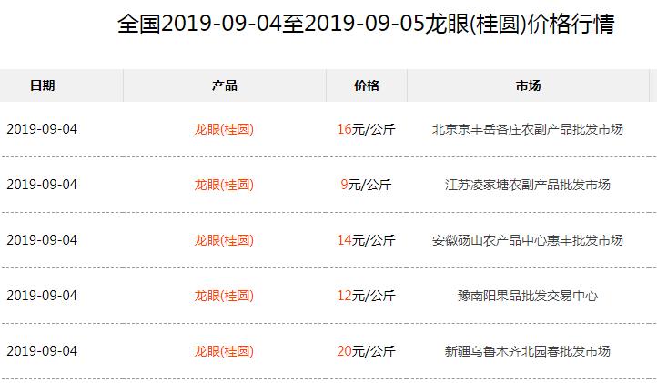根据全国农产品商务信息公共服务平台提供的信息,2019年09月04日桂圆的价格各地不同,有的地方价格高些,为20元/公斤,有的地方价格低些,为9元/公斤。具体价格信息如下: