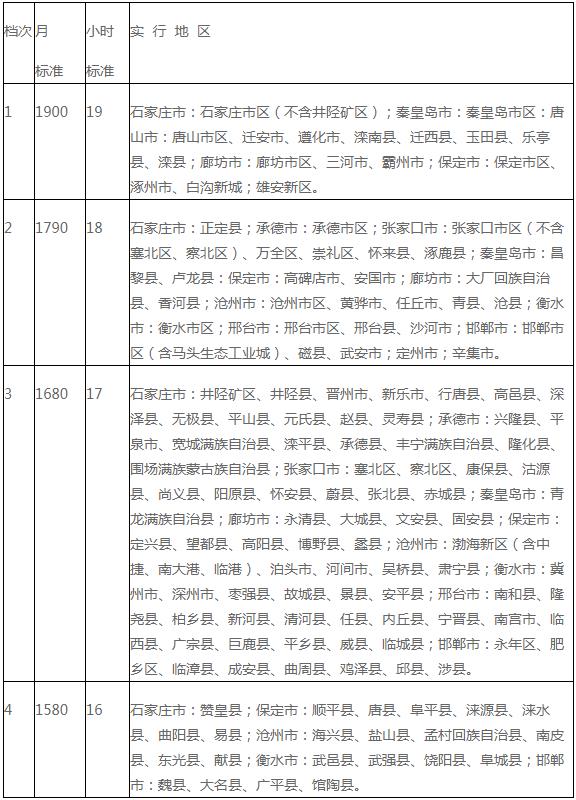 2019年9月20,河北省人力资源和社会保障厅印发了《关于调整河北省最低工资标准的通知》(冀人社发[2019]34号),本次调整的月最低工资标准分为四档,每档工资标准是多少?