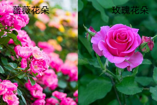 花朵:蔷薇的花朵一般是6-7朵簇生,生在枝条的顶端,花直径1.5-2厘米,花色有红色、粉色、黄色、白色等,玫瑰花一般是单生或3-6朵簇生,花径6-8厘米,花色多为紫红色、粉红色或者红色。