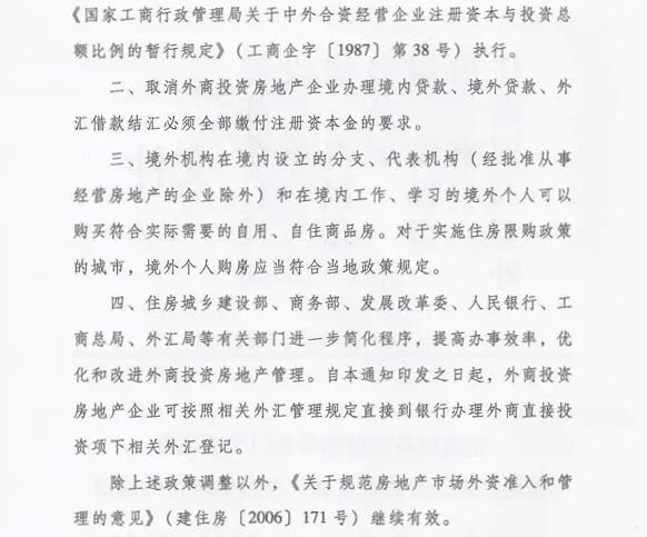 除上述政策调整以外,《关于规范房地产市场外资准入和管理的意见》(建住房[2006]171号)继续有效。