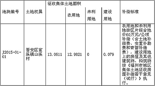 根据《中华人民共和国土地管理法》第48条、《中华人民共和国土地管理法实施条例》第25条、《福建省实施〈中华人民共和国土地管理法〉办法》第23条规定和《福建省人民政府关于福州市晋安区2015年度第一批次农用地转用和土地征收的批复》(闽政地〔2015〕470号),现将征地补偿安置方案和有关事项公告如下: