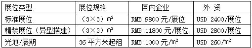 ※注:标准展位:三面围板(2.5m高)、楣板、射灯二支、洽谈桌一张、椅子二把220V插座一个。