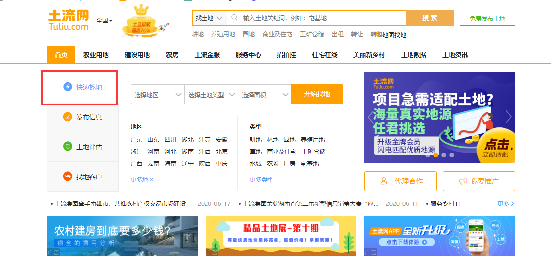 怎样快速的找到合适的地源 作者:admin • 更新时间:2023-07-01 •阅读 0 第一步:登录土流网电脑端。 第二步:点击首页→点击快速找地按钮。 第三步:在快速找地栏目中,填写所需土地的区域、土地类型、面积等信息,点击“开始找地”。 声明:本网页内容为来源互联网,旨在传播知识,若有侵权等问题请及时与本网联系,我们将在第一时间删除处理,E-MAIL:320919107#qq.com。#改@ 怎样快速的找到合适的地源:http://www.3jise.com/article/178213.html