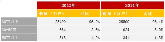 土地流转带来耕地集中和规模化生产。尽管目前小规模分散经营仍占主流,2014年经营耕地规模在30亩以下的小户比例高达96.1%,这部分农户的平均每户经营面积小于3亩。但30亩至50亩的中型农户在2014年超过了1000万户,增幅54%。