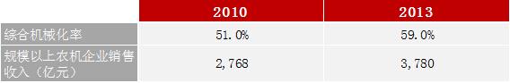 农业部在今年8月发布了《关于开展主要农作物生产全程机械化推进行动的意见》。指出要在2020年争取实现68%的农业机械化率。公开的数据显示,2010年到2013年,农业机械化率从51%提升到59%,在此期间,规模以上农机企业收入从2768亿元提升到3779亿元,提供了1000亿元的市场增量。那么未来五年机械化率从61%提升到68%,同样会带来巨大的市场空间。