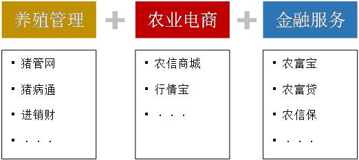 大型农业企业,结合农业生产信息化,也在布局农业金融。他们建立的业务体系主要有三个模块,一是向农户提供经营养殖信息系统,实现云端管理;二是开拓网上农资产品商城;三是金融服务。此外还有一些增值服务,例如养殖教育、市场资讯。