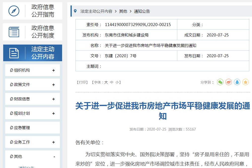 2020年7月25日,东莞市住建局联合市公安局、市场监督管理局等12个部门共同发布了《关于进一步促进我市房地产市场平稳健康发展的通知》。通知涉及土地供应、限购政策、商品房转让年限等9个方面的内容,其中购买商品房证满3年才能转手,购买二手房需1年社保。