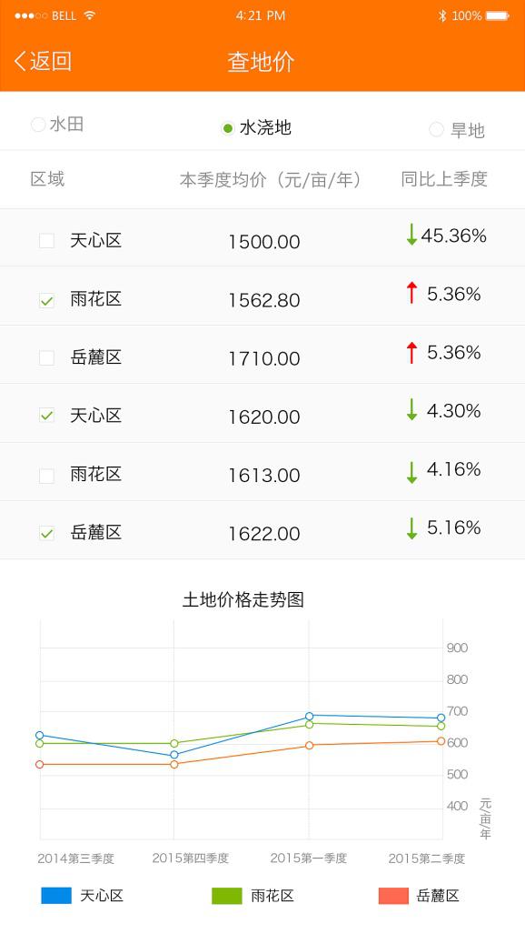 土流网对积累建立的土地行业信息数据库进行多维度数据分析,掌握了各地的土地价格走势。点击客户端中“查地价”功能模块,即可查看到不同区域、不同土地类型的地价曲线图。