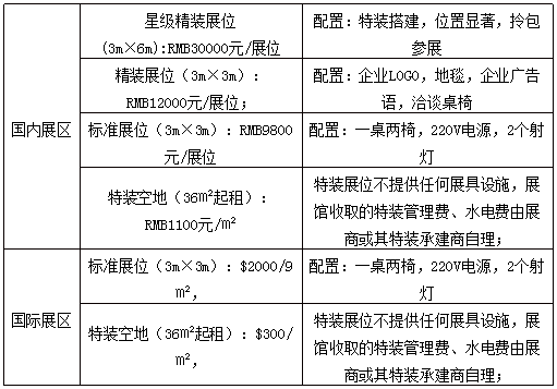 标准展位(3m×3m):RMB9800元/展位配置:一桌两椅,220V电源,2个射灯