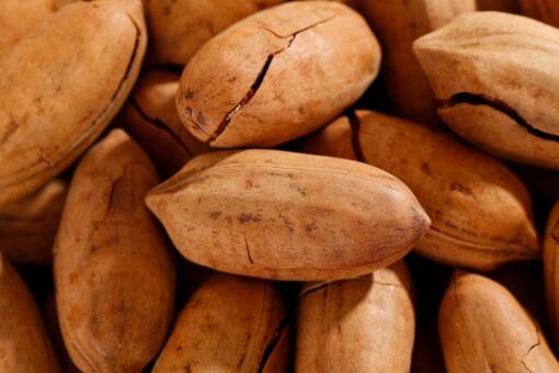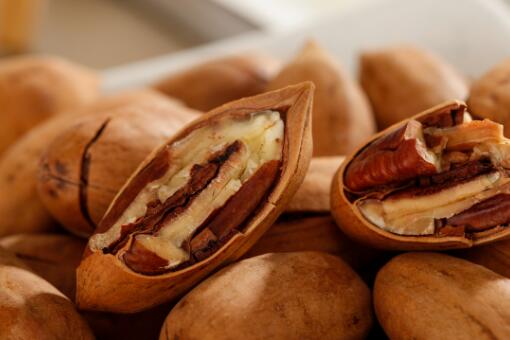 碧根果在成熟后,果子会自然裂开,且从口子出可看到褐色的果仁,表面有油光。