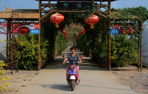 8月29日,杨素环骑电动自行车上班。今年48岁的杨素环是河北省石家庄市藁城区杜村村民,3年前村里搞起土地流转,办起农业合作社,杨素环加入禾苗农业合作社,主要用大棚种植蔬菜和水果,每天工作八个小时。“棚子里有专门的技术员给指导,干起活来很省心。”说起现在的工作,杨素环十分高兴,“把五亩多地流转给合作社,一亩每年能拿到1500元的租金,我一天工资50元,还不累,算下来一年能比过去多收入3万多元钱。”5月份,杜村围绕科技大棚建设观光生态园,开展餐饮、采摘、钓鱼、农活体验等项目,吸引更多城市里的居民到这里消费。据了解,目前杜村已有560多户加入合作社,土地效益明显提高。近年来,石家庄市藁城区积极探索农村土地流转政策,采取“农民自愿、合理流转”的原则将农田向规模特色农业、高效农业和无公害农业集中,力促农村土地规范流转带动现代农业发展。目前全区土地流转总面积已达到15.93万亩,流转土地农户约3.25万户,占农户总数20%。土地流转不仅让农民变身农业工人,更改变了他们的生产生活方式。