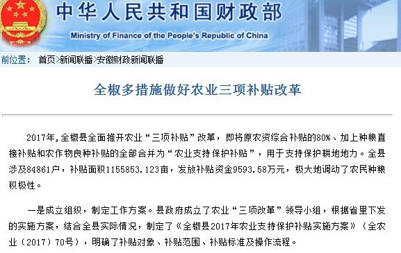 据财政部资料透露,2017年,安徽省滁州全椒县全面推开农业“三项补贴”改革,即将原农资综合补贴的80%、加上种粮直接补贴和农作物良种补贴的全部合并为“农业支持保护补贴”,用于支持保护耕地地力。全县涉及84861户,补贴面积1155853.123亩,发放补贴资金9593.58万元,极大地调动了农民种粮积极性。
