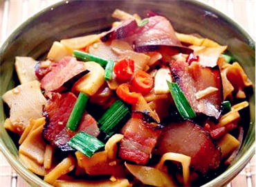 腊肉是经腌制后再经过烘烤(或日光下曝晒)的过程所制成的加工品。腊肉的防腐能力强,能延长保存时间,并增添特有的风味。