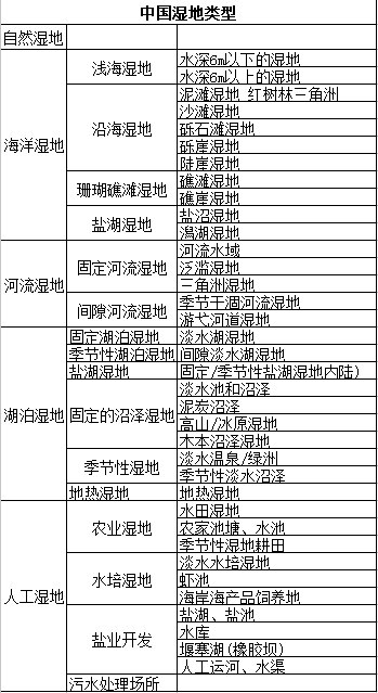 《中国湿地保护行动计划》(国家林业局等,2000)提出了沼泽湿地、湖泊湿地、河流湿地、浅海滩涂湿地及人工湿地五部分,而在《全国湿地资源调查与监测技术规程(试行本)》(林业部,1997)中,则除了没有划出人工湿地外(水库被包括在湖泊湿地中),几乎与拉姆萨尔公约联络处提出的完全一样。