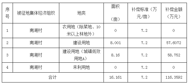 4、批准征地面积:项目用地面积:1.0774公顷, 其中:征收南湖村集体土地1.0774公顷(计16.161亩),其中一般建设用地0.5334公顷(计8.001亩),建设用地(城镇低效用地A)0.544公顷(计8.16亩)。