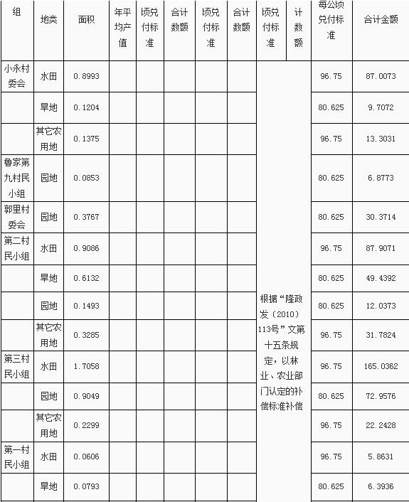 (一)本次征收土地的补偿标准按《中华人民共和国土地管理法》第四十七条、《云南省土地管理条例》第二十三条和二十四条、《云南省国土资源厅关于公告实施〈云南省征地统一年产值标准和区片综合地价补偿标准〉(试行)的通知》、《隆阳区人民政府关于印发隆阳区建设用地土地征收补偿暂行办法的通知》(隆政发〔2010〕113号)规定,制定具体标准和数额如下:(单位:公顷、万元)