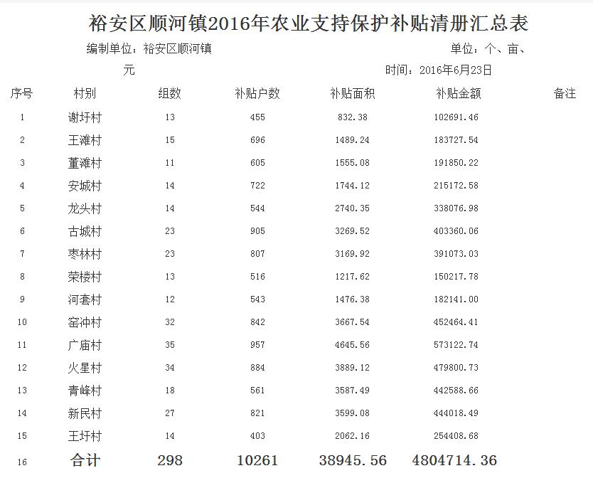 裕安区顺河镇2016年农业支持保护补贴清册汇总表
