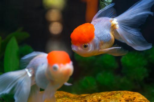 雌雄不同的金鱼,在体色上略有差异,雄鱼一般颜色鲜艳,而雌鱼略淡一些,在繁殖发育期,雄鱼体色更为鲜艳。