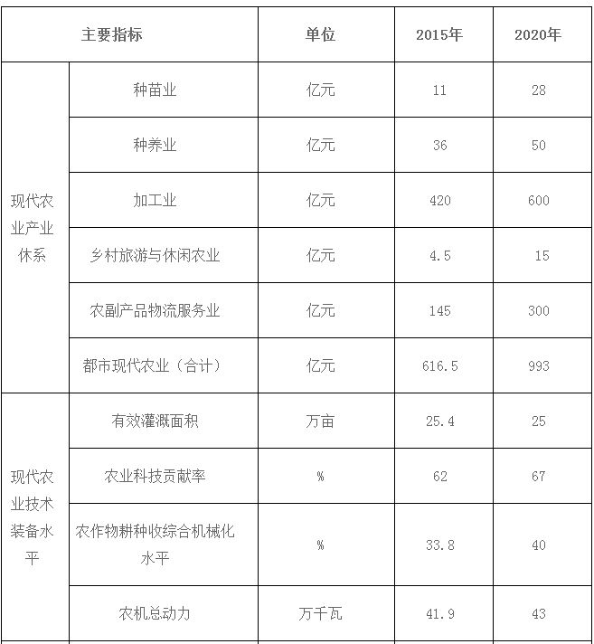 加快转变农业发展方式,走产出高效、产品安全、资源节约、环境友好的农业现代化道路,力争到2020年,都市现代农业建设取得明显进展,都市现代农业产业集群产值达到1000亿元;农民生活达到全面小康水平,农村居民人均收入提前全国三年实现比2010年翻一番,城乡居民收入差距缩小到2.2:1;城乡基本公共服务均等化水平稳步提高,农村基础设施加快提升,农业生态环境明显改善,社会主义新农村建设水平进一步提高;农村基本经济制度、农业支持保护制度、城乡发展一体化体制机制进一步完善,基本形成城乡统筹协调互动发展新格局。