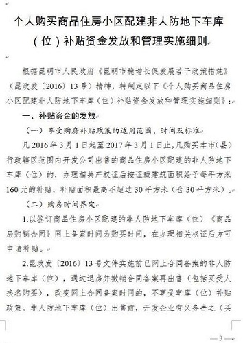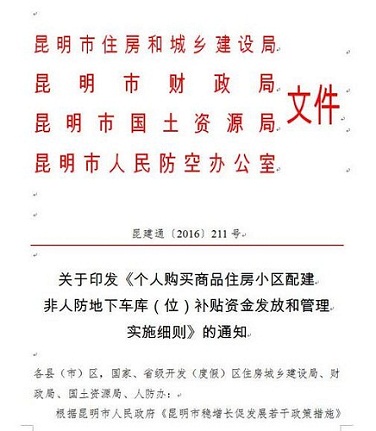 2016昆明市《个人购买商品住房小区配建非人防地下车库(位)补贴资金发放和管理实施细则》:http://www.3jise.com/article/58776.html