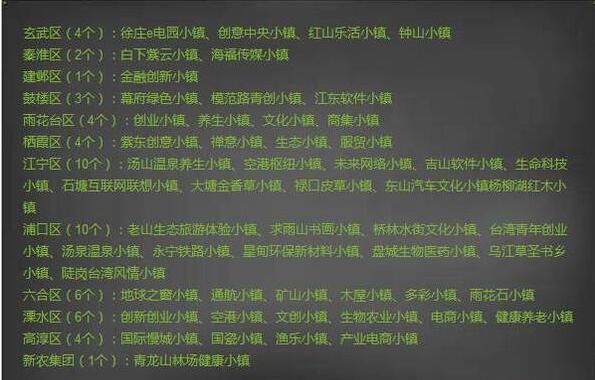 江宁区(10个):汤山温泉养生小镇、空港枢纽小镇、未来网络小镇、吉山软件小镇、生命科技小镇、石塘互联网联想小镇、大塘金香草小镇、禄口皮草小镇、东山汽车文化小镇杨柳湖红木小镇