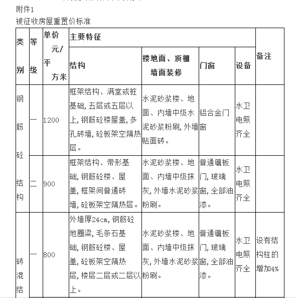 附件:1.被征收房屋重置价标准