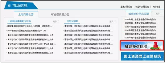 打开“河南省国土资源厅”官方网站,下拉页面至“市场信息”栏目,在页面右侧有“征地补偿标准”字样,单击之后即可进入搜索页面。搜索栏目中有“省辖市”“市辖县”等选项,搜索得到的页面包含“区片编号”“征地补偿安置费”“区片范围描述”,其中“征地补偿安置费”分别依每亩和每公顷的标准予以表示,“区片范围描述”分为“乡镇名称”和“行政村”两栏。