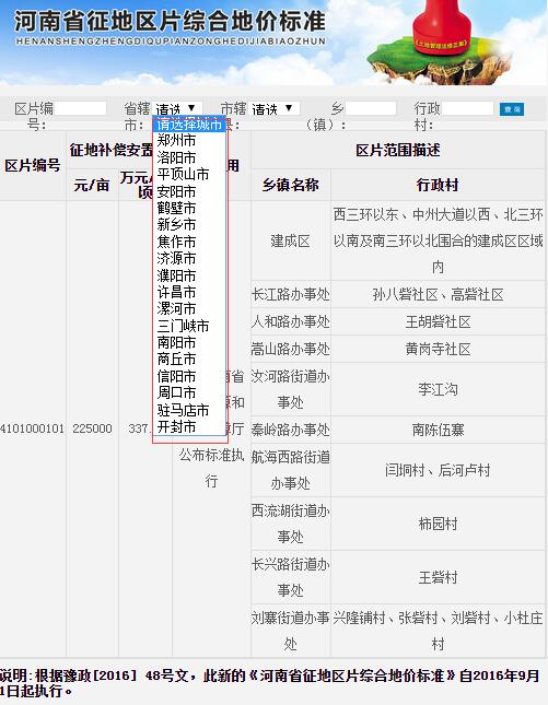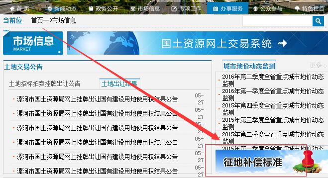 进入官网查询的步骤是:打开“河南省国土资源厅”官方网站,下拉页面至“市场信息”栏目,在页面右侧有“征地补偿标准”字样,单击之后即可进入搜索页面。搜索栏目中有“省辖市”“市辖县”等选项,搜索得到的页面包含“区片编号”“征地补偿安置费”“区片范围描述”,其中“征地补偿安置费”分别依每亩和每公顷的标准予以表示,“区片范围描述”分为“乡镇名称”和“行政村”两栏。