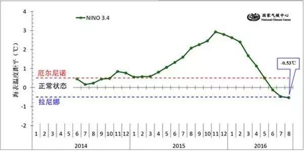 自2014年9月开始的超强厄尔尼诺事件于2016年5月结束后,赤道附近中东太平洋海表温度持续走低。8月份监测结果表明,拉尼娜/厄尔尼诺监测区海温距平指数较上月又下降0.05℃,达到了-0.53℃,表明赤道中东太平洋海表温度已偏离正常,进入拉尼娜状态(见图1)。